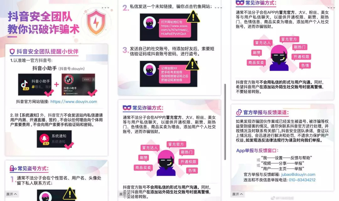 同时,抖音方面也称,抖音没有客服电话,一些不法分子在网上散布所谓抖音客服电话进行诈骗,抖音账号被盗因涉及提供证明材料,所以现在只开通了邮件申诉。