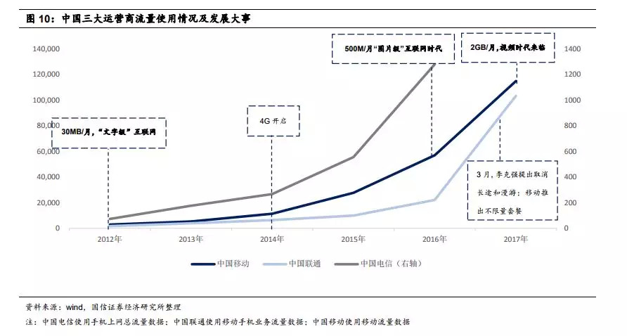 自 2017 年以来,流量不限量套餐的资费价格一路走低,2018 年 7 月,中国移动、中国联通、中国电信等三大运营商已全面落实取消手机流量漫游费措施,并表示将进一步提速降费。同时,我国 5G 技术落地不断推进,三大运营商陆续公布了 5G 部署计划,力求在 2020 年实现正式商用。三大运营商在5G上的推进,再加上NBIOT的建设,毫无疑问流量费用的低门槛行会进一步刺激用户的使用能力,进而加速视频市场的扩张。