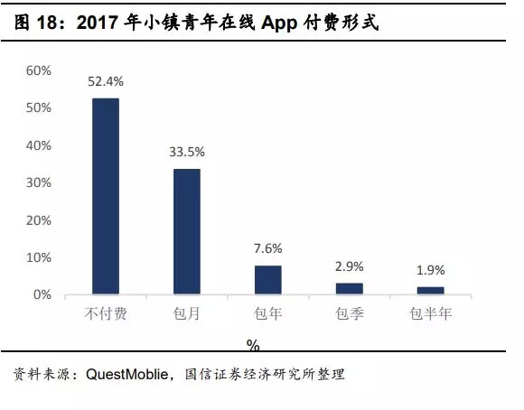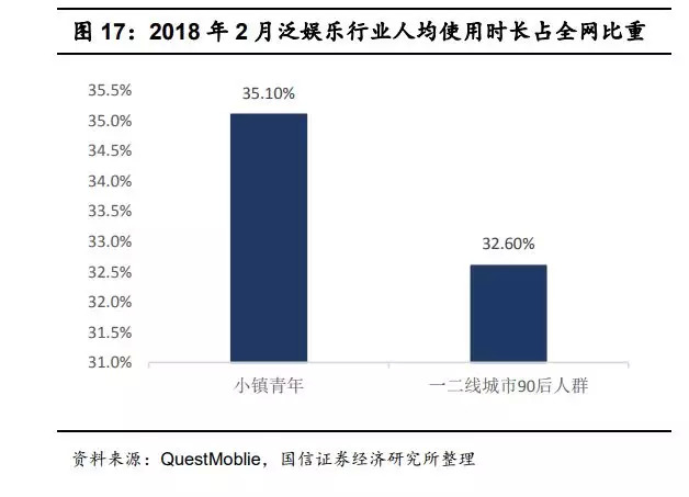 2017 年,我国三四线城市人 均可支配收入达 3.64 万元,同比增长 8.27%。据 QuestMobile 数据显 示,2018 年 2 月,小镇青年规模高达 2.12 亿,渗透率同比增长 38.6%。三四线城市青年在泛娱乐行业月人均使用时长超越一二线城市青年,其消费能 力较强,在线视频付费比例接近 50%。