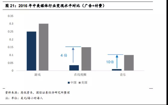 2016 年,中国居民消费支出中,娱乐类支出占比仅3%, 韩国8%、日本9%、相比于美国的9%、台湾10%,仍然存在较大差距。众视媒体认为,中国年人口基数大决定了中国潜在的巨大消费能力。对比 2016 年中美媒体行业变现水平,除游戏变现水平差距较小外,在线视频、音乐等领域单位用户变化水平相差仍在 4 倍以上。