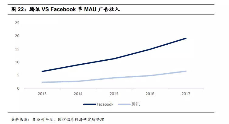 2017 年我国互联网巨头腾讯的网络广告收入为 404 亿元,与 Facebook 广告收入体量 接近,从单 MAU 广告收入计算,腾讯 2017 年单月活广告收入约为 6.49 美元, 约为 Facebook 的 1/3。