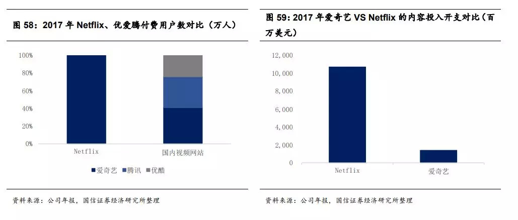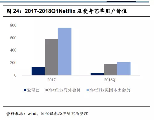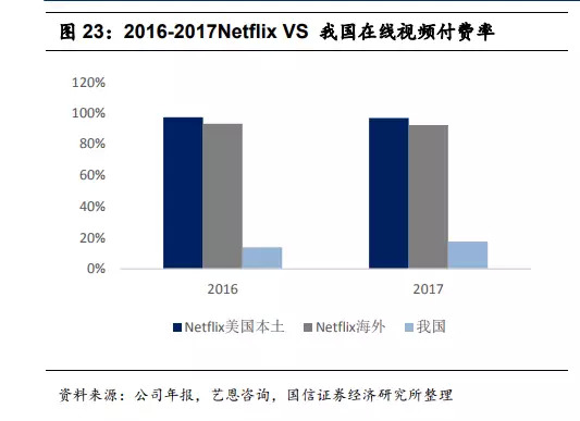 从付费收入角度来看:Netflix 付费率约为我国视频网站付费率的 5 倍,单用 户 ARPU 值约为我国视频网站的 5.6 倍。 从付费渗透率来看,截至 2017 年底, 我国主流三大视频网站优酷、腾讯及爱奇艺的付费用户总数为 1.24 亿人(未去 重),占我国网络视频总量的 17%;而 2018Q1,Netflix 本土及海外的付费渗透 率为 97.1%及 93.4%,约为我国视频网站付费率的 5 倍。从单用户付费收入角 度,2017 年单用户 ARPU 值为 113.5 元,相比于 Netflix 单用户 100 美元的收 入,在线视频付费用户仍有 5 倍左右提升空间。
