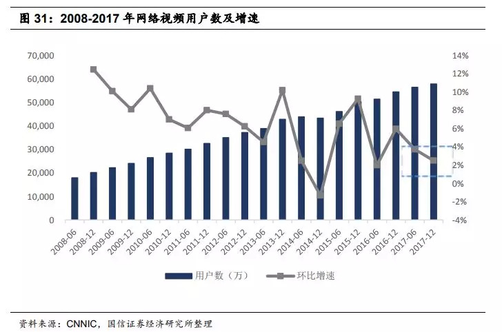 国内视频网站流量变现经历基础变现、体验变现和生态变现三大阶段,18 年以来着力发挥自制内容在年轻群体影响力、深化年轻群体变现价值。CNNIC 数据显示,2017 年我国网络视频用户数为 5.79 亿人,同比上半年增长 2.5%。