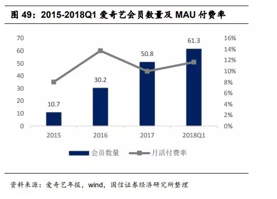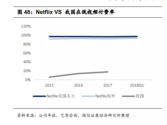 2017 年,我国在线视频整体付费率为 17.5%,约为同期 Netflix 付费率的 1/5。以国内在线视频头部平台爱奇艺为例,2018Q1,其付费用户数约为 6130 万人,占 同期月活数量比重为 11.64%,与 Netflix 等商业模式成熟的视频网站相比,我国在线视频付费率仍有较大可提升空间。