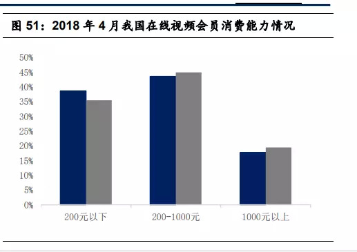 2017 年,我国在线视频用户付费市场规模约为140.8 亿元,单用户 ARPU 值为 113.5 元,相比于 Netflix 单用户约 100 美元的收入,我国在线视频付费用户有 5 倍左右提升空间。以爱奇艺为例,2018Q1,其单用户付费值仅为 35 元,仅为同期 Netflix 美国本土 会员单用户付费值的 16.9%。同时,QuestMoblie 数据显示,当前我国在线视频付费用户有 47.3%来自一线城市,约 19.5%的用户文娱领域月消费水平在 1000 元以上,200-1000 元区间内消费用户占比显著高于行业平均水平,单用户付费可提升空间较高。当前,我国在线视频流量变现处于初级阶段。