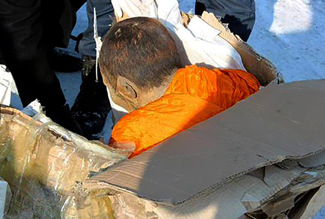 上周,这具浅灰色的和尚木乃伊在蒙古首都乌兰巴托Songino Khairkhan区被发现,当时全身还覆盖着一层牛皮。目前,其肉身保存完好,仍呈盘腿莲花坐式,且已被送往乌兰巴托的国家司法鉴定中心(National Centre of Forensic Expertise)作进一步研究。