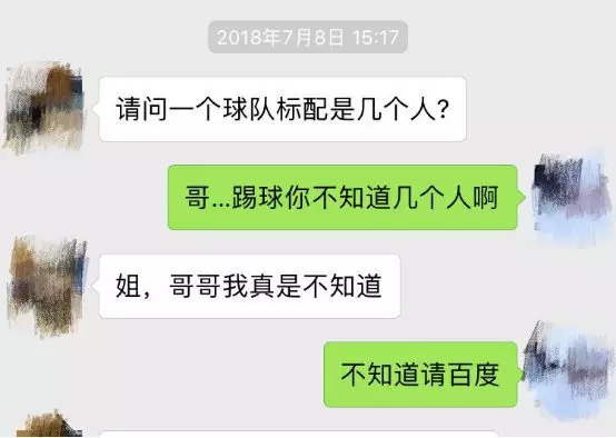 这个发生在世界杯期间,估计是看我是球迷,就问我球队有几个人。你可以不知道,但是麻烦这种动动手就能百度到的能不能不要问我,大家没时间这么尬聊。你如果不是球迷其实真的没必要非得跟我聊球~