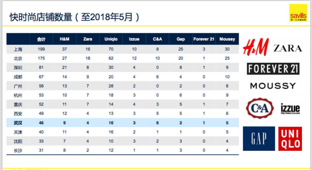 若以快时尚的店铺数量来反映零售状况,第一太平戴维斯2018年的最新数据显示,武汉总计46家店铺,和排名第一、有199家门店的上海颇有差距,它甚至也被重庆、西安甩在后面,在全国排名第9。