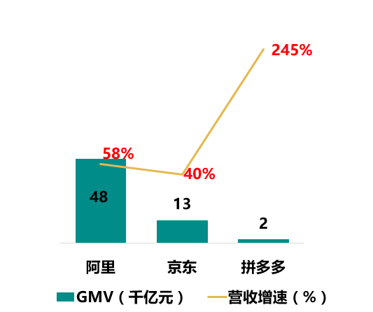拼多多年度活跃用户规模超过京东,坐上综合电商第二把交椅,GMV突破千亿大关,用时不足三年(淘宝5年,京东10年),电商黑马搅动市场格局;