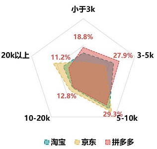 拼多多早期的成长,来源于其病毒式连锁传播模式,从而实现了用户数量的迅猛扩张,但不得不注意的是,用户流量裂变、低价商家聚合的模式,伴随着更多的是商家良莠不齐,假货、质量差等负面评论不绝于耳,与此同时,用户当前对拼多多的定位在于便宜,因此虽然用户规模直逼阿里和京东,但单个买家年平均消费金额却较低,从MobData大数据来看,拼多多的用户收入水平明显不及京东用户,因此未来如何提高人均消费,实现用户由量到质的转变是关键。