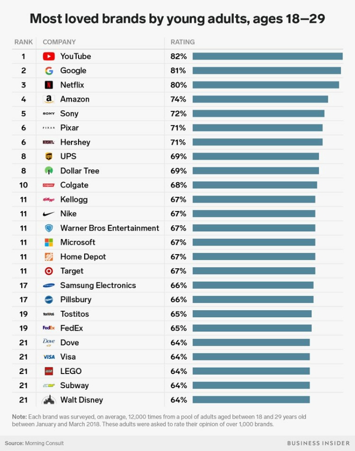 近日,市调机构MorningConsult发布2018年最受年轻人欢迎的25家品牌名单,以观察这一群体最愿意将钱花在哪里。最终,YouTube、Google和Netflix高居榜单前三名,受到超过8成受访者的喜爱。