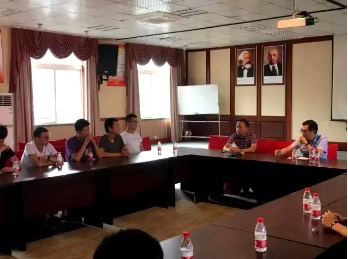 池方燃(右1)向平阳退役军人分享创业经验
