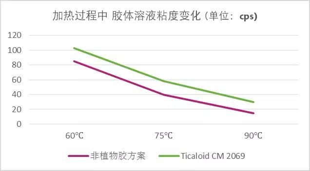 通过加热过程的记录,可以发现Ticaloid CM 2069和非植物胶方案的粘度差异不大,使用Ticaloid CM 2069无需对工艺进行改变,避免增加生产成本。
