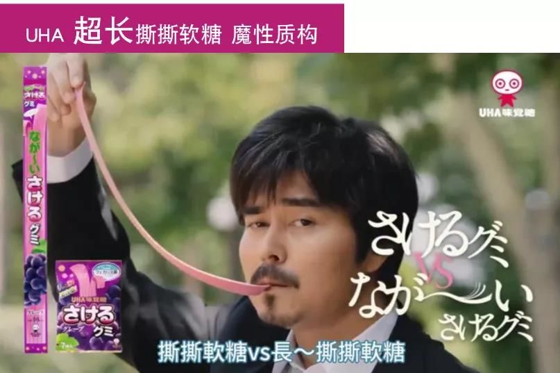 UHA另一款糖果,今年新推的40cm长的超长撕撕软糖不仅长度魔性,而且还能撕开享用,如此魔性的质构,让它迅速爆红。它的广告也是相当地“难以言表”,在社交媒体上传播甚广。