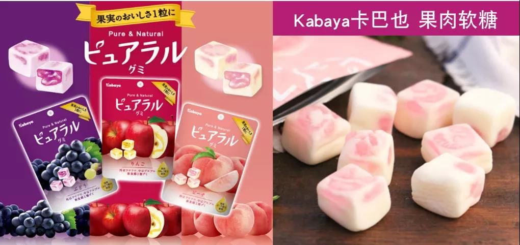 除了像UHA味觉糖以肠衣+果肉般的内馅取胜的,同样来自于日本的Kabaya卡巴也果汁夹心软糖则是另一种风格,绵软的棉花糖包裹着浓郁果汁软糖,讲究“水果感”和“食感”,追求果实本来的美味,吃一口就蔓延真正的水果风味,外面蓬松,里面香嫩的新口感。双层质构塑造双重享受。