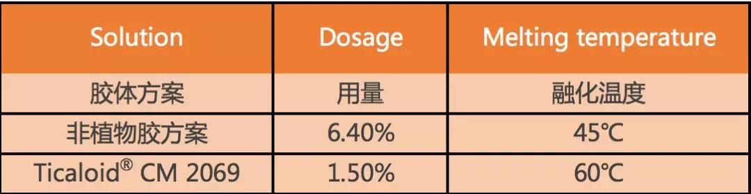 同时这款产品耐高温,便于运输及贮存,有利于保持产品稳定性。研究发现,Ticaloid CM 2069的融化温度(60℃)要比非植物胶方案(45℃)高,耐高温的特性使得终产品在长途运输以及高温环境下拥有良好的稳定性。