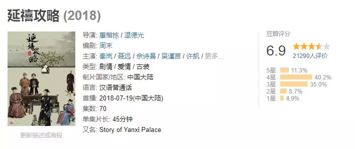 此次《延禧攻略》低调播出,却在不经意间赢得了网友的欢心。在豆瓣上,《延禧攻略》得到了21000多名网友打分,而且竟然得到了6.9分的评价,这与3.6分的《凤囚凰》形成了鲜明对比。“不耍心机、不白莲花的反套路女主”,“服化道制作精良,画面质感好”,“富察皇后是当之无愧的团宠”等正面评价比比皆是。可以说,《延禧攻略》让于正迎来了一场漂漂亮亮的口碑翻身仗。