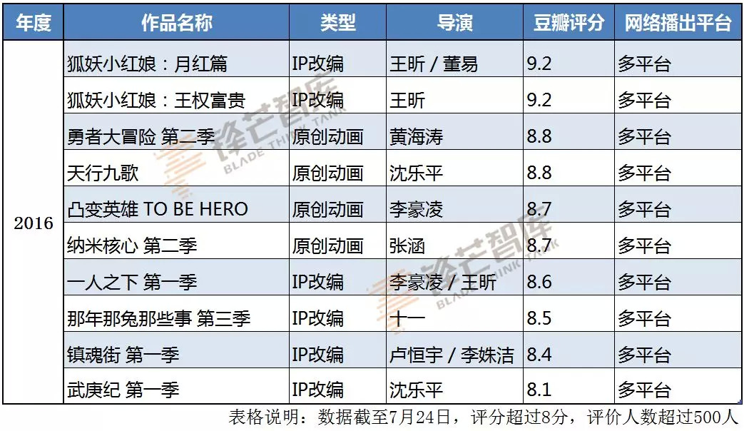 2016年高分榜单里,《狐妖小红娘》持续走红,两个篇章豆瓣都超过9分;与此同时,网文、漫画IP改编动画逐渐火热,以3D动画为主的制作质量有明显提升,侧面反映资本正在入场。
