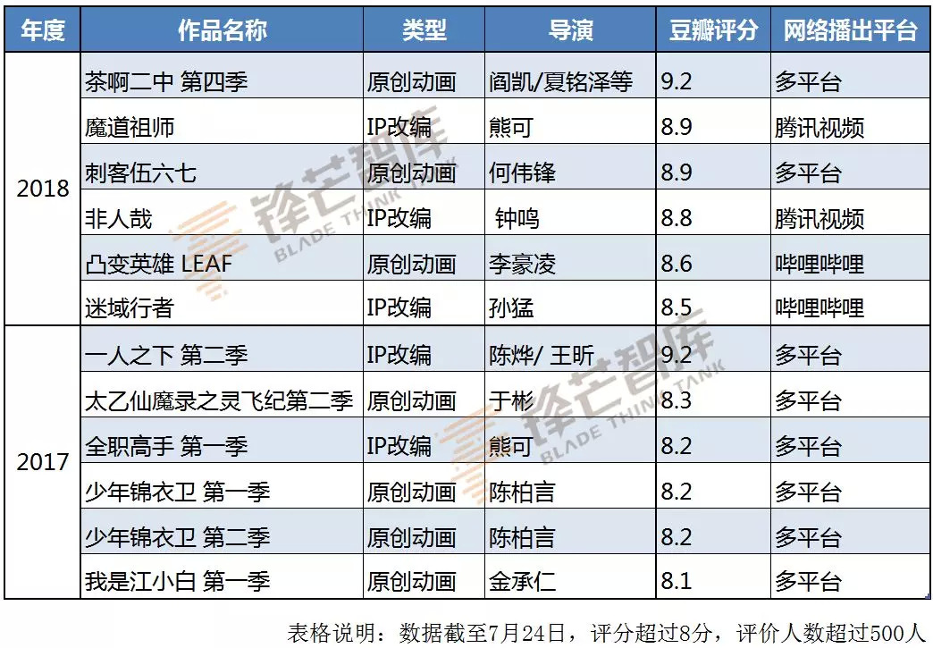 高分榜单里,熊可、李豪凌、王昕、沈乐平等导演名字都不止一次出现。这些导演背后基本都形成了固定工作室或动画公司,如视美动画制作的《全职高手》和《魔道祖师》均由熊可导演,《狐妖小红娘》《一人之下》《凸变英雄》背后的绘界文化公司CEO是李豪凌导演本人,由此可见,第一梯队的国漫主创势力已经运作成熟。