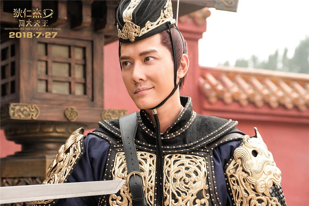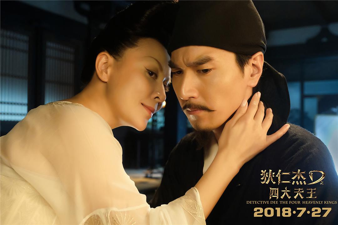 从类型构成上看,《四大天王》在悬疑探案的铺陈明显不如之前两部,狄仁杰那种类似福尔摩斯通过思维重现犯罪现场出现次数不多,这当然与悬疑事件本身的强度不够也有关系。《通天帝国》里有着贯穿全片的“焚尸案”,而在后两部前传中一般开场出现的悬疑事件在电影中段便已水落石出,电影进入第三幕则更多将视角关注在更宏大的权力斗争上,同时大量的视觉奇观也更多集中地出现在最后的“决战”中。