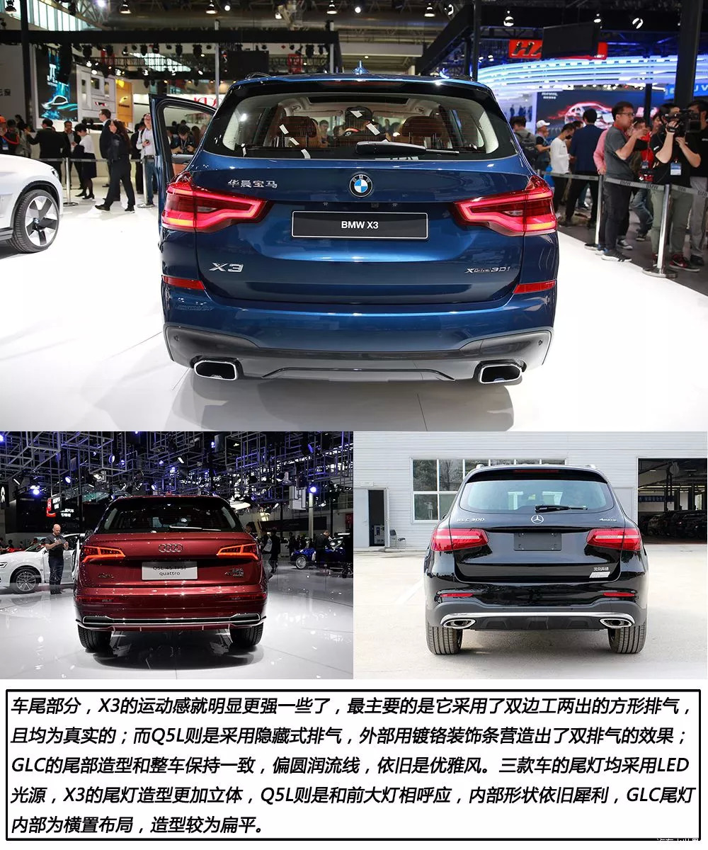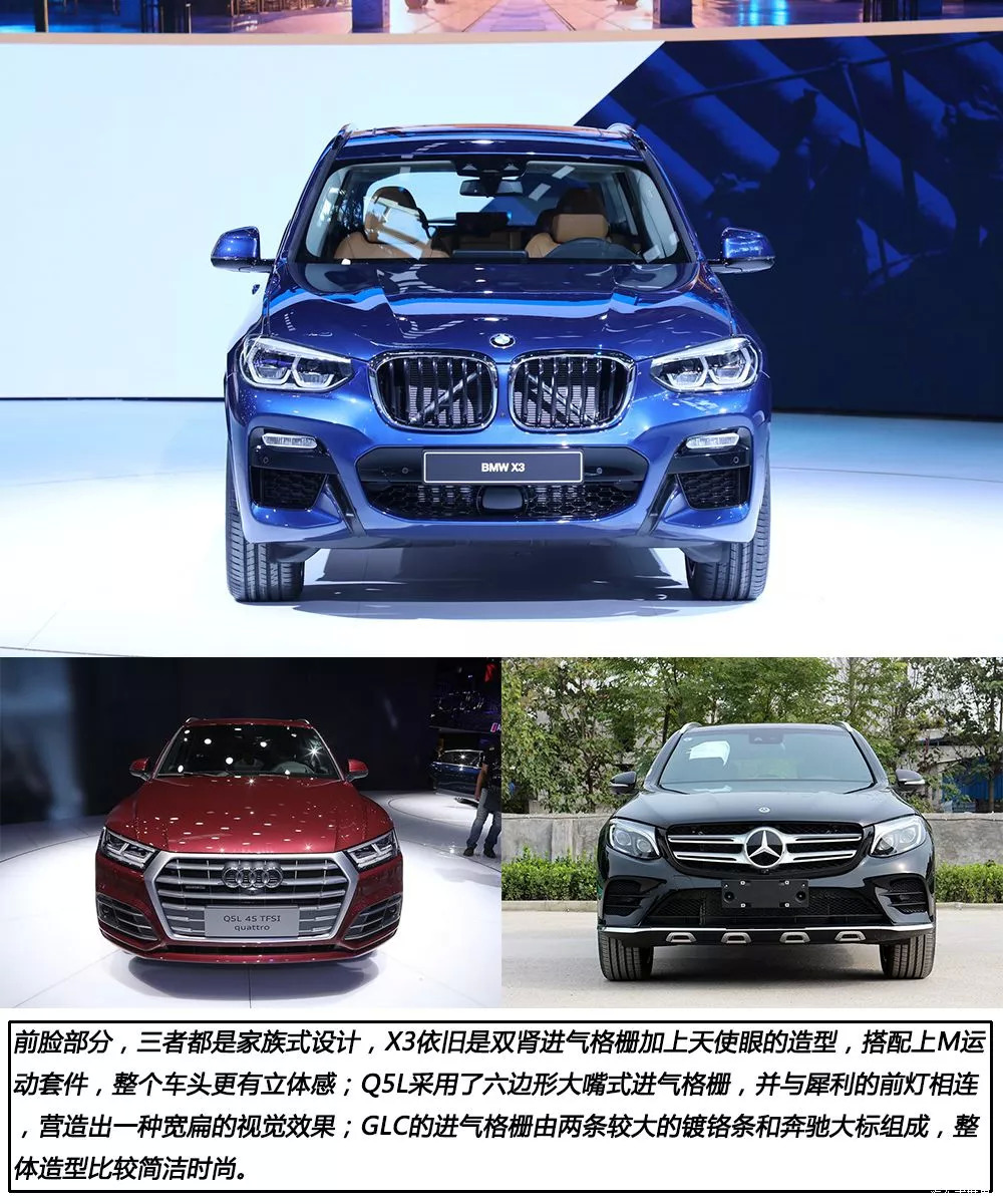 外观:X3 M套件更运动,Q5L棱角分明,GLC则是圆润流畅