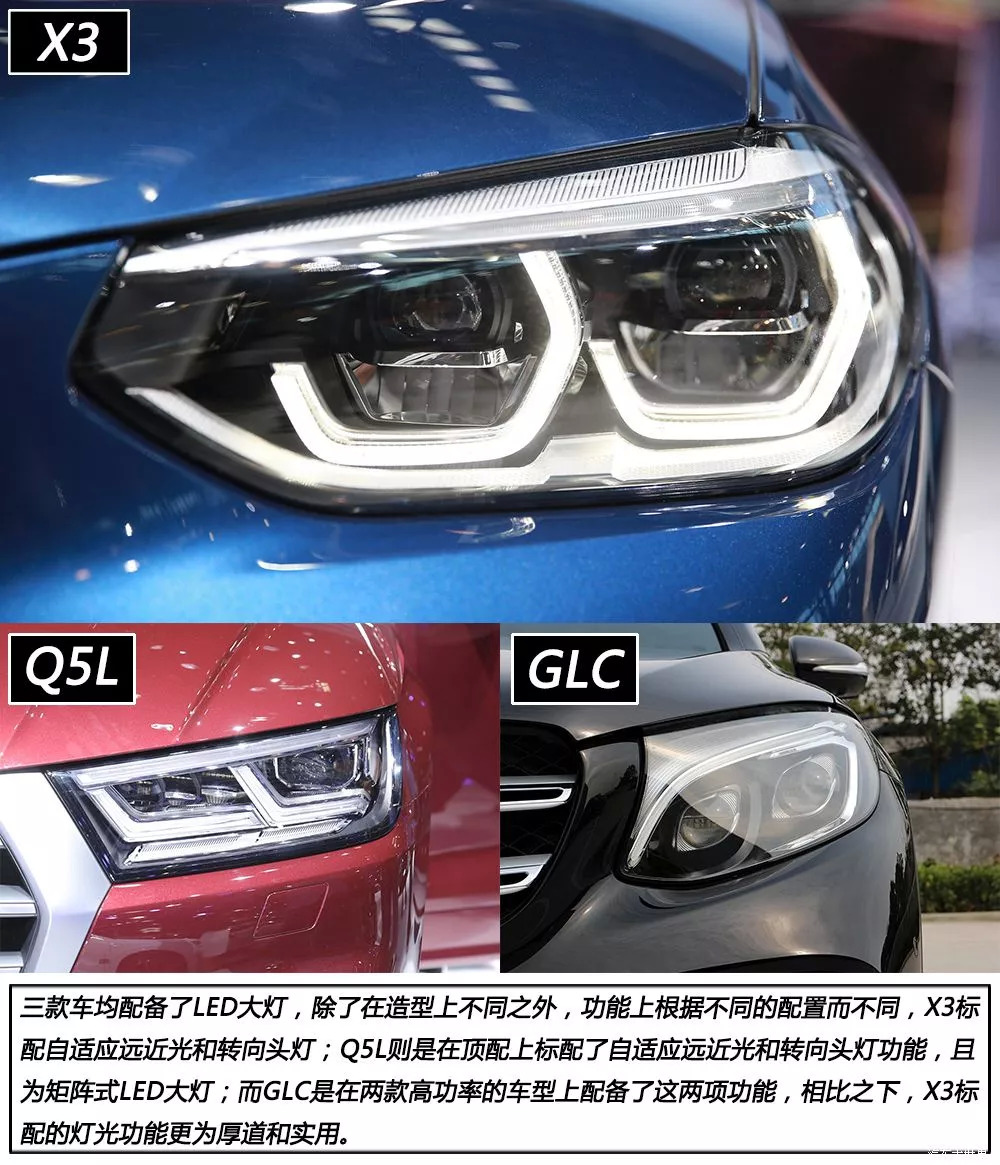 在差异化配置上,X3相对来说会更丰富些,比如X3多出了倒车影像、第二排靠背角度调节、座椅记忆、GPS导航系统、自适应远近光、转向头灯、前雾灯、内后视镜防眩目、后视镜记忆等;Q5L相比两款车就没什么多出来的配置了,GLC只多了换挡拨片和膝部气囊。
