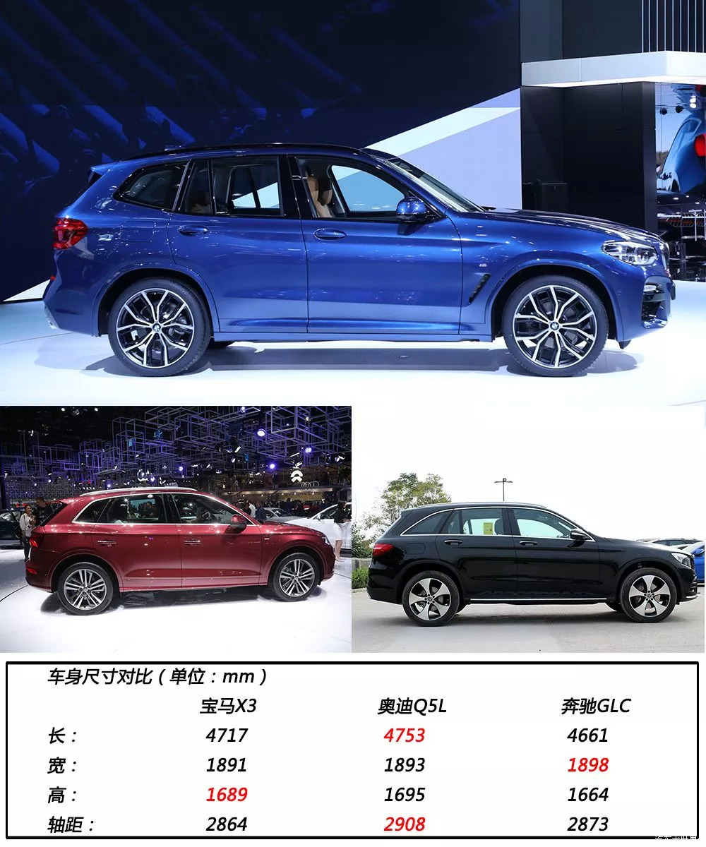 从车身尺寸上来看,经过加长的Q5L有着更大的车内乘坐空间,只是高度上比X3低了30mm,这一点从侧面就能看出来,Q5L相对有着更低矮的视觉效果;X3虽然国产了,但还是坚持着“原汁原味”的设计不进行加长,但尺寸相比上一代车型整体更大一些;GLC的车长是最短的,而宽度是最宽的。另外,Q5L贯穿整个车身的线条比较凌厉,X3侧面的线条贯穿车门把手,这两款车都凸显了力量感,GLC则是比较舒缓流畅的线条,显得比较优雅。