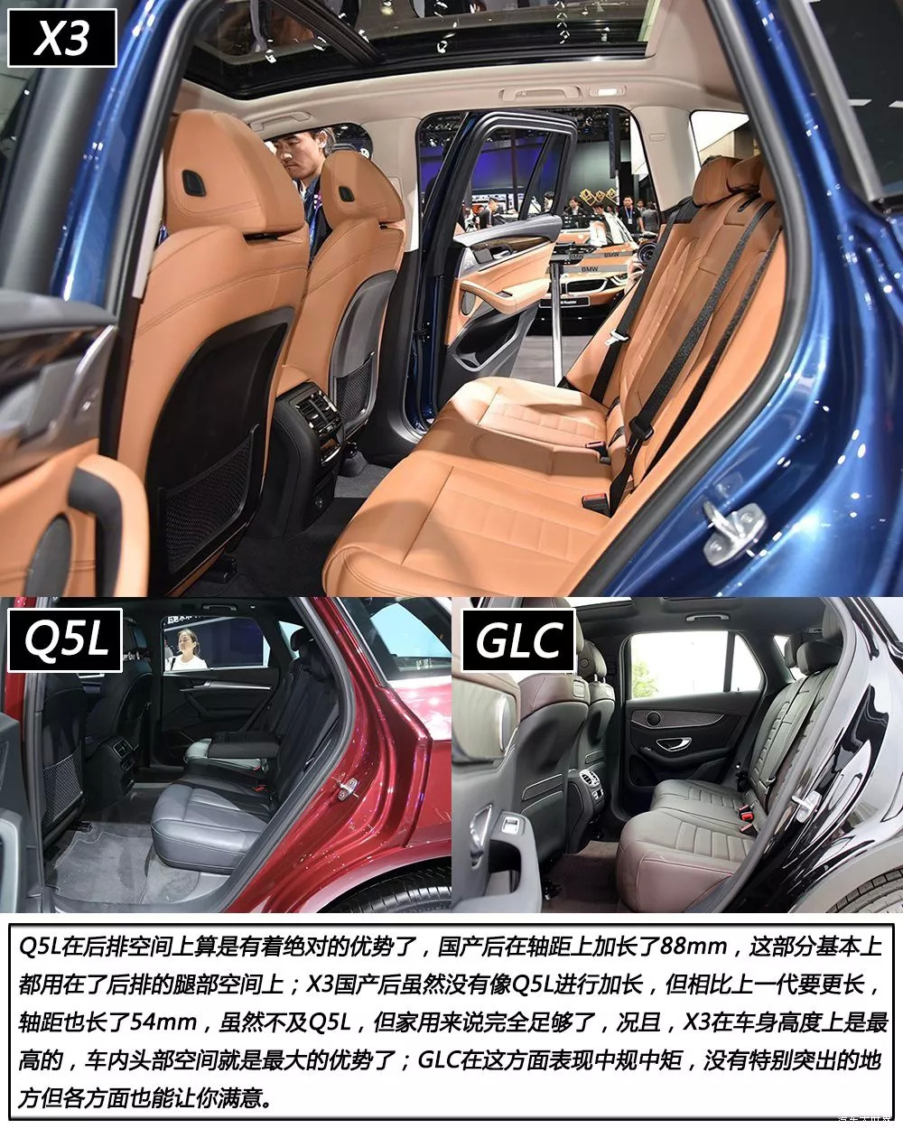 内饰部分可谓是特点分明,X3凸出豪华氛围和层次感,Q5L偏向于科技感运动感,而GLC则是典雅中透露些惬意的气氛。三款车内饰都比上一代有进步,不过都没有给人太多惊喜,都是属于家族式风格。