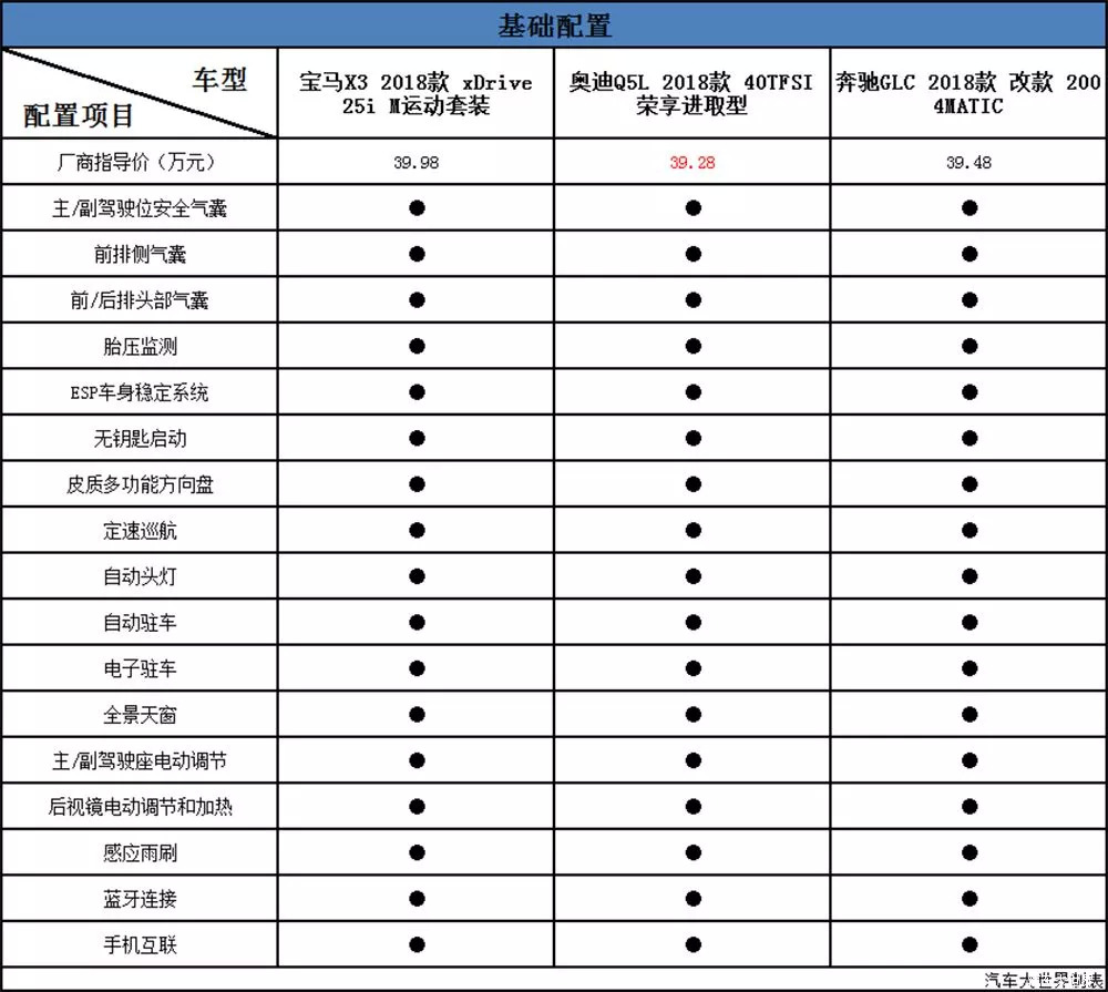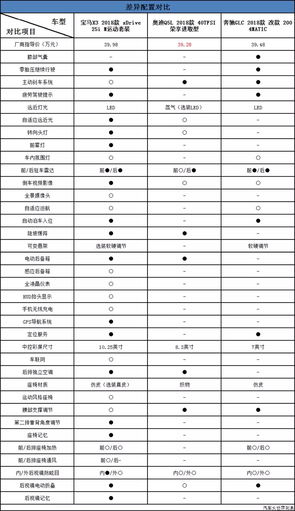 我们选取了各自车型的最低配,分别是宝马X3 2018款 xDrive 25i M运动套装、指导价39.98万元,奥迪Q5L 2018款 40TFSI 荣享进取型、指导价39.28万元,奔驰GLC 2018款 改款 200 4MATIC、指导价39.48万元。