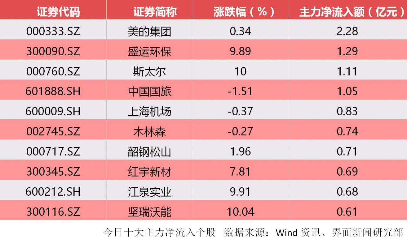 个股表现上看,沪深两市共有4只个股主力净流入额超过1亿元。除去未开板新股,美的集团(000333.SZ)、盛运环保(300090.SZ)、斯太尔(000760.SZ)吸引主力资金净流入居前,分别获2.28亿元、1.29亿元、1.11亿元主力资金流入,斯太尔连获8连板。