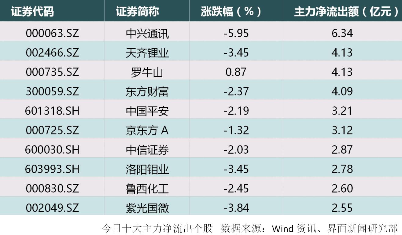 沪深两市共计51只个股主力资金净流出额超1亿元。中兴通讯(000063.SZ)、天齐锂业(002466.SZ)、罗牛山(000735.SZ)分别遭6.34亿元、4.13亿元、4.13亿元主力资金流出忝列前位;ST长生(002680.SZ)复牌跌停。