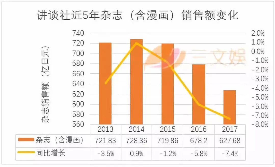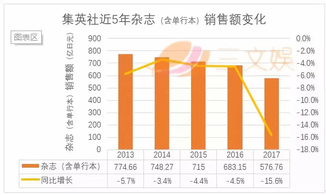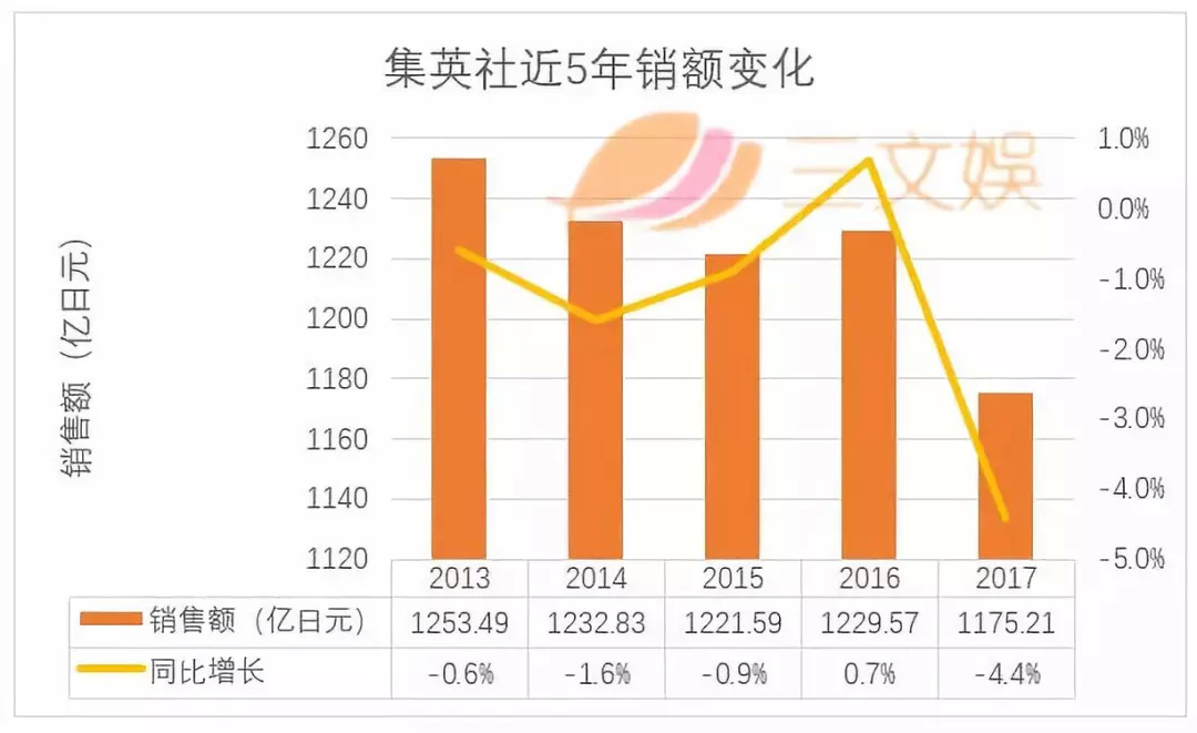 从集英社近5年来杂志板块的销售额变化来看,2017年的下降幅度继2012年后再次跌破两位数。这种不景气的状况不止集英社一家,小学馆、讲谈社等各大出版公司相关业绩表现皆令人担忧。