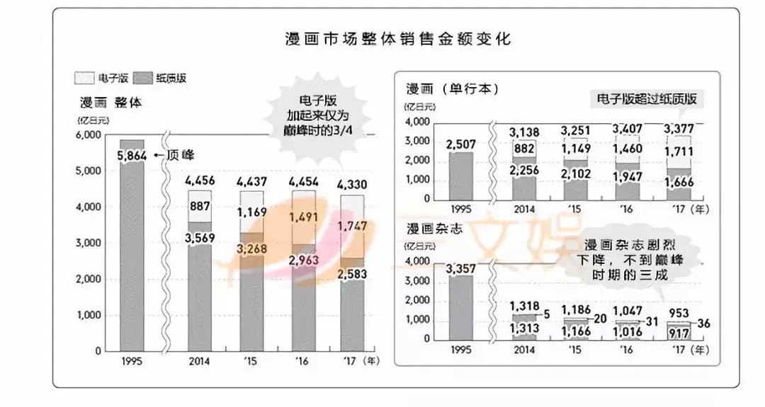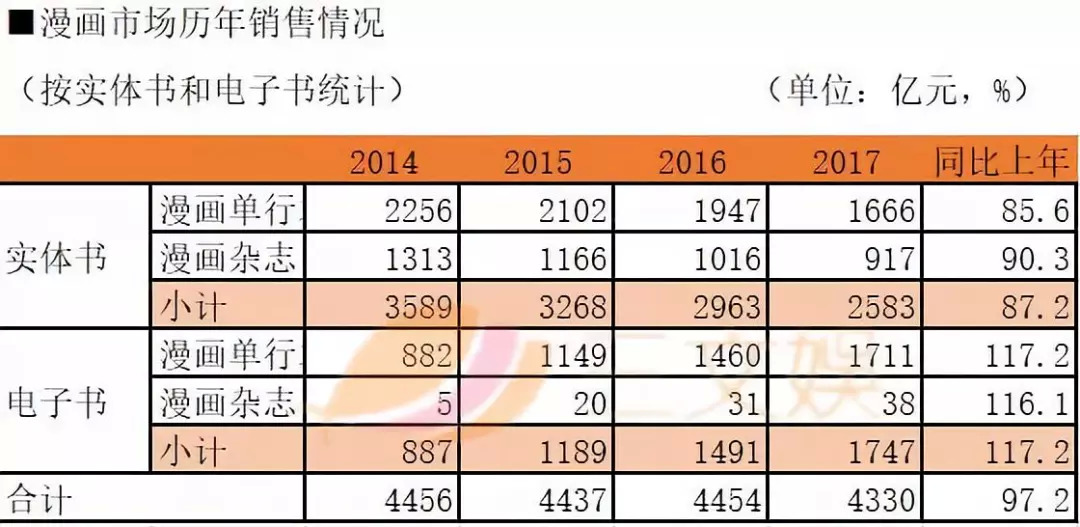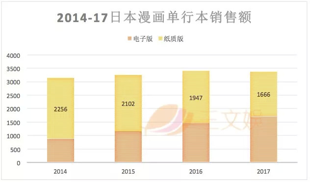 根据出版科学研究所于2018年2月26日公布的2017年度漫画市场业绩统计,2017年日本漫画市场销售额继续下滑,实体书和电子书总销售额4330亿日元,较去年下降2.8%。