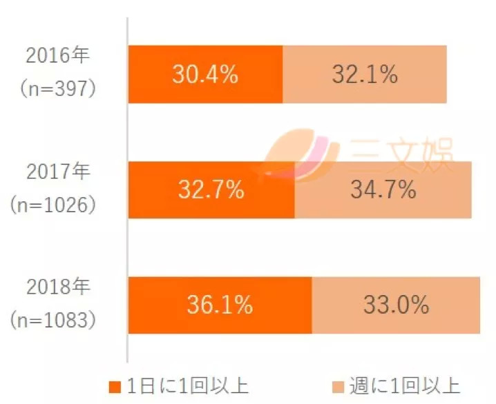 Impress的调查结果也显示,免费阅读漫画的应用软件和网站服务的使用率正在稳步增长。其中免费漫画应用的使用率比去年增加了0.8个百分点,为28.4%。根据1083份有效问卷结果得出,免费漫画应用的使用频度在“一天1次以上”的人群占36%,而“一周1次以上”的用户合计为69.1%,利用频度比去年的调查增加了1.7%。