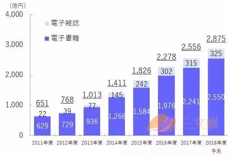 另一个部分电子杂志市场规模(类似电子书市场定义,不包含通信,设备,广告收入等部分)为315亿日元(比上一年增加4.3%)。因此,2017年度电子书和电子杂志合并的电子出版市场总额为2556亿日元。
