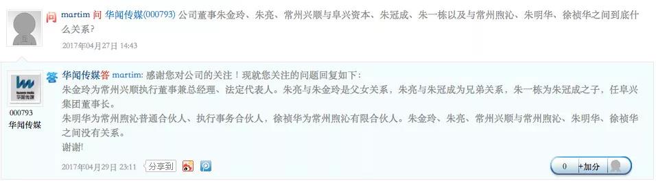 野马财经发现,在深交所互动易平台,华闻传媒确认了朱金玲、朱冠成、朱一栋三人的血缘关系。朱一栋为朱冠成之子,朱金玲哥哥。