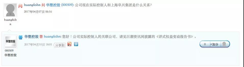 然而在2017年4月10日,在深交所互动易平台,华塑控股却表示阜兴集团为公司实际控制人的关联公司。