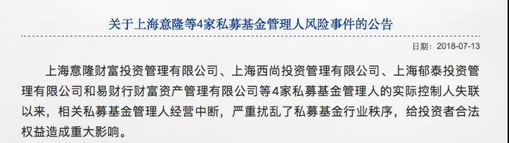 中国证券基金业协会于2018年7月13日发布风险警示,提及了意隆财富、西尚投资、郁泰投资、易财行4家私募基金。这些基金皆与朱氏家族关系密切。