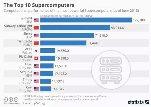 今年7月,美国的超级计算机Summit超过神威·太湖之光,在最新的全球超级计算机Top 500榜单中,重新夺回了第一名的位置。