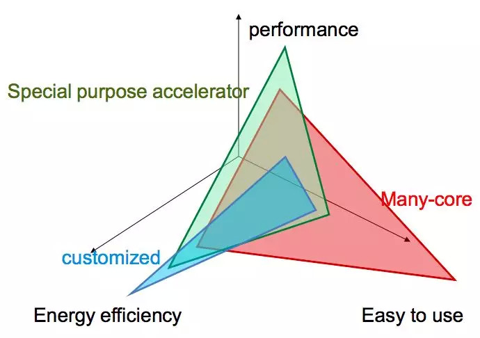 张云泉告诉新智元,从现在的趋势来看,未来中国三台E级超级计算机都会采用众核加速的体系结构,所不同的只是众核的架构,一种是异构众核,一种是主从众核,还有一种是多核处理器和众核加速器完全分离的柔性异构众核。