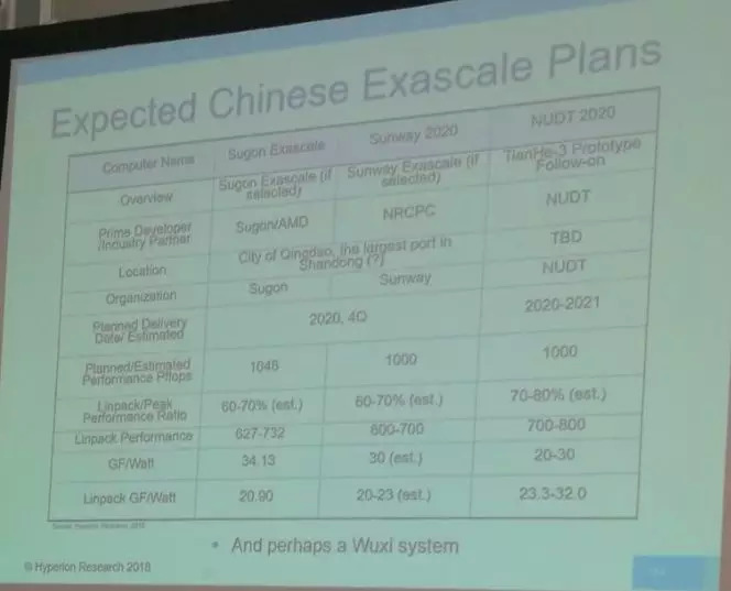 不过,中国顶级的超级计算机研究人员、同时在中山大学和北航担任教授的钱德沛博士,在2017年11月举行的SC大会上做了报告《中国在百亿亿超级计算方面的努力:现状与前景》(China’s Effort on Exascale Computing: Current Status andPerspectives),其中提到了中国三台E级原型机的一些细节: