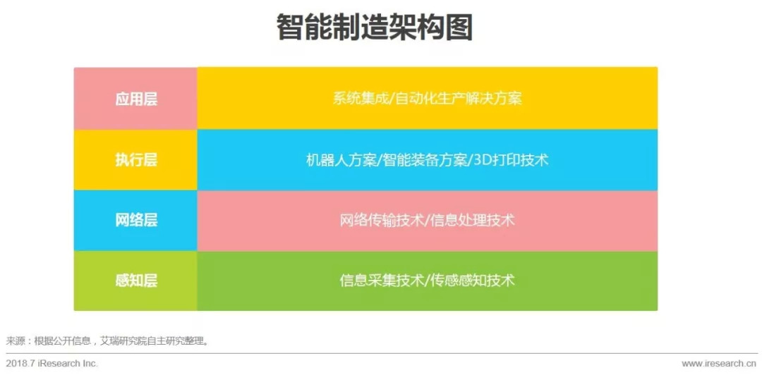 智能制造产业链可分为感知层、网络层、执行层和应用层,在感知层主要依靠传感器、RFID、计算机视觉等技术来采集数据;在网络层通过云计算、大数据、工业互联网技术和智能芯片完成对数据的处理及传输;在执行层依靠机器人、智能机床、3D打印等设备接收指令进行作业;在应用层通过自主运行整个生产流程,在全局范围内自我学习、自我优化,实时适应新的环境,最终形成智能工厂。
