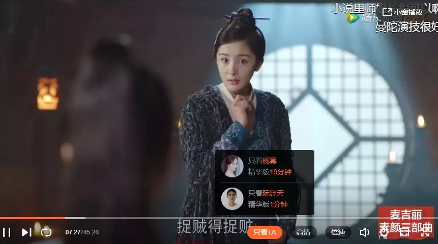 为满足这部分的观众的需求,视频网站也做出来更为人性化的设置,比如视频网站中的“只看TA”的设置。在视频播放过程中,点击右下角的“只看TA”选项能够选择观看某位演员的个人版视频。如近日热播的《扶摇》中,爱奇艺便推出了“只看杨幂”和“只看阮经天”的设置板块。