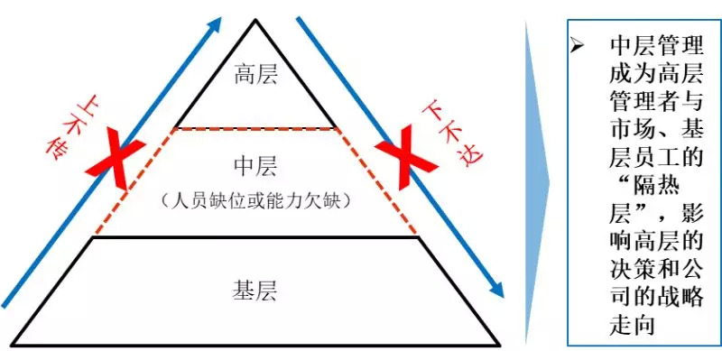 因此,很多企业存在中层能力断档的困扰,本应充当企业“沟通纽带”的中层管理者,却变成高层和基层及市场的“隔热层”,成为“煮熟的鸭子”。在此情况下,高层制定的战略和经营计划无法下达到基层,基层在战略执行过程中遇到的问题和市场动态也无法及时、准备地反馈给高层,直接影响企业的战略落地和稳步发展。