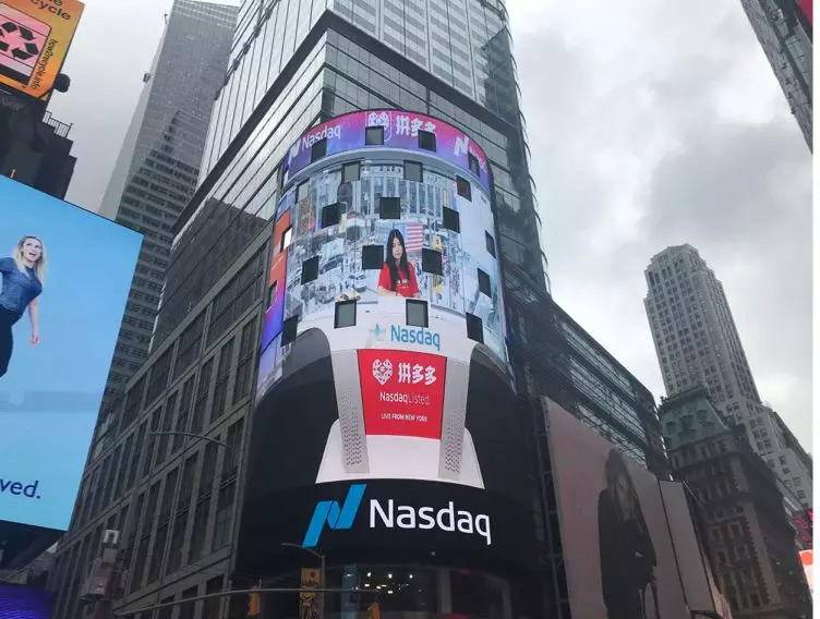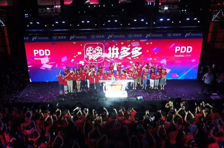 纳斯达克还首次采取两地同时敲钟的形式,来迎接这家年轻的中国互联网公司,幸运消费者代表在纽约敲钟,黄峥在上海参加敲钟仪式,敲钟者依然是一家五口的消费者代表,两地敲钟仪式上,一共有39位“拼友”见证。