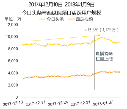 今日头条在发展自身业务的过程中也积累了一定优势,其中很重要的一个就是流量。QuestMobile公布的数据显示,截至2018年1月9日,今日头条日活已近1亿。