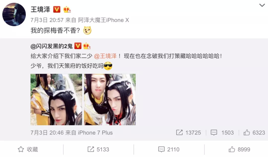 据王境泽个人微博里透露的信息,仅从今年7月开始到年末,这位网红就已经获得了遍布全国的20几家漫展活动的邀请。此外在7月4日,王境泽还为西山居在微博组织“剑网3有毒玩家”活动,发布了一条玩“真香梗”的视频,以及几张《剑网3》藏剑成男的COS照。