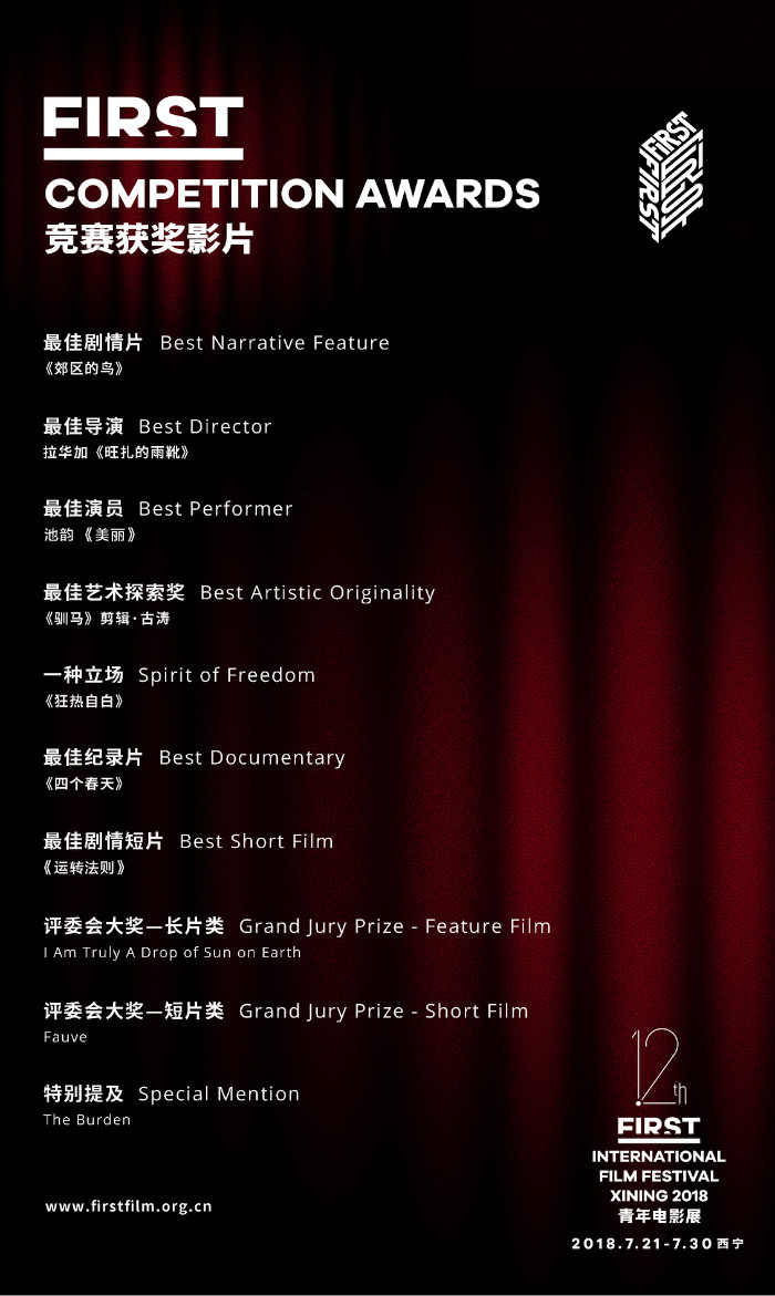 FIRST影展共设置最佳导演、最佳剧情片、最佳纪录片、最佳剧情短片、最佳动画/实验片、最佳演员、最佳艺术探索奖、评委会奖——长片类、评委会奖——短片类和一种立场共十个奖项。奖杯为“板砖”造型,立意为青年电影抛砖引玉、添砖加瓦。FIRST奖项秉持宁缺毋滥的原则,今年最佳动画/实验片奖项就因在创作观念、文本创意、导演能力、技术水准等方面曝露出各种问题没有选出足够优秀的作品而取消。