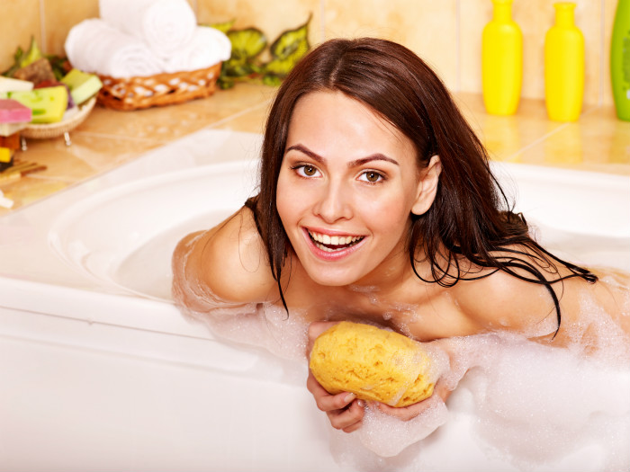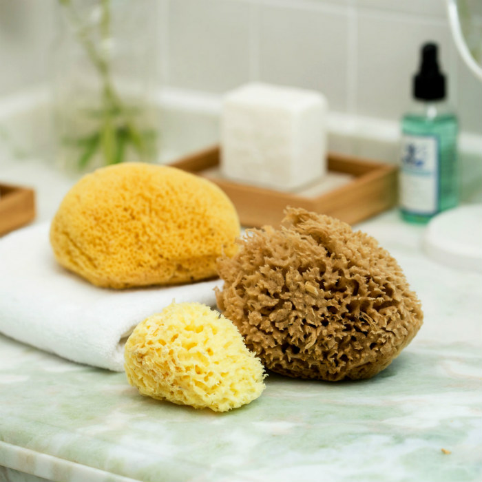 使用时,先湿润天然海绵(由于海绵的强吸水性,湿润海绵时不必将海绵沾满水),再将香皂沾水或奶、液、膏等抹在天然海绵上并使之产生泡沫,然后涂抹在全身肌肤或脸上,并用不同的按摩速度和压力,上下左右打圆圈方式清洁。天然海绵的清洁力度是普通用手的数倍,并可节省沐浴乳液,皂的用量。