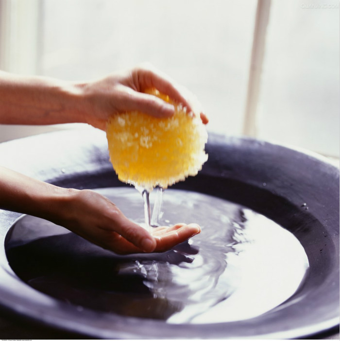第一次使用海绵时,请将干的天然海绵浸润在冷水中,轻轻揉捏,或浸泡数分钟,吸收完水分后它的体积会变大一圈,也会变得很柔软,这时候用起来很舒服。